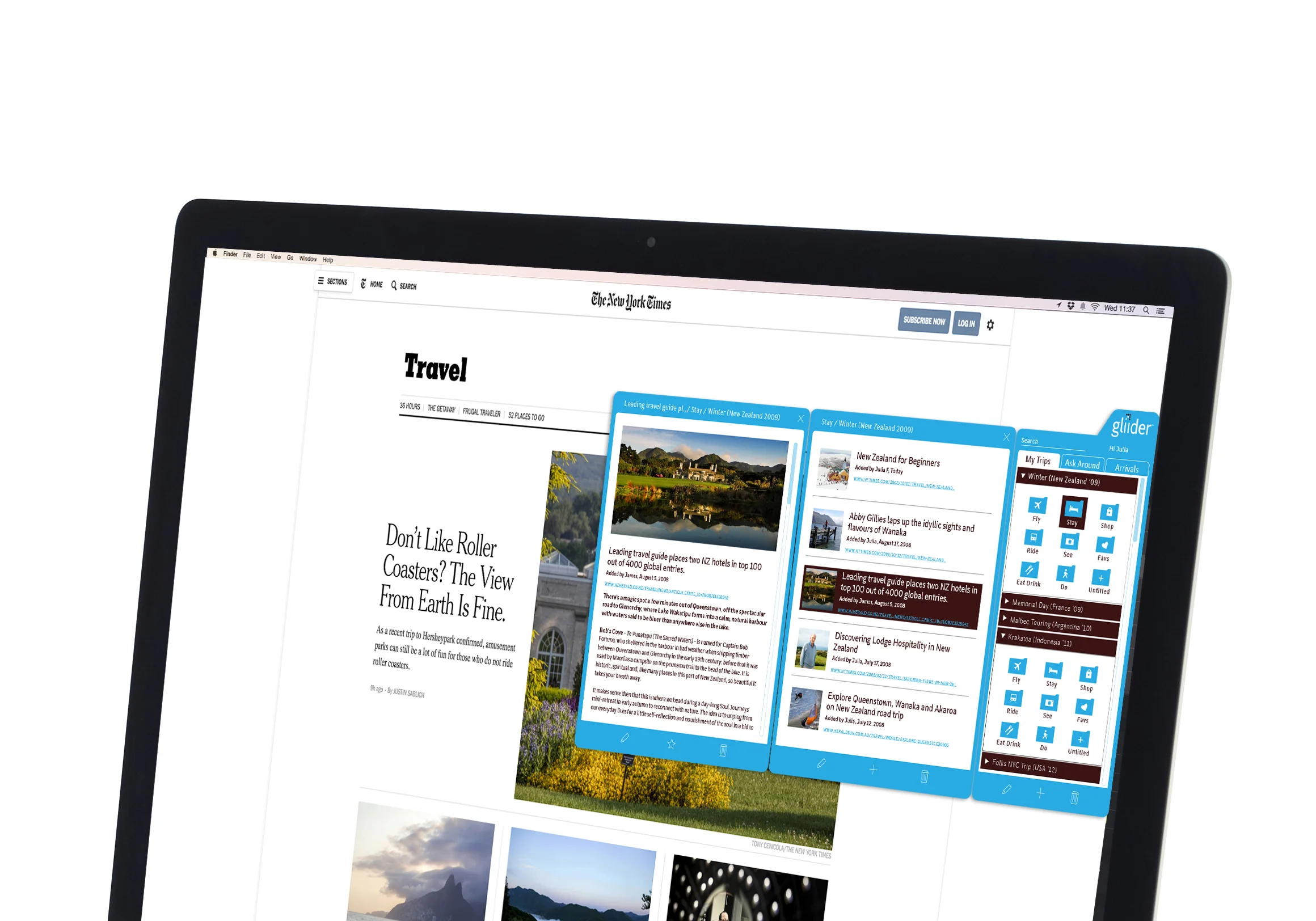 People spend a lot of time researching and planning travel, with no good, multi platform solution to keep everything organized. My partner Jordan Stolper and I set about to address that need with gliider, a research tool that helps you gather and save travel infomation from any site on the web, and then get deals specific to your trip.