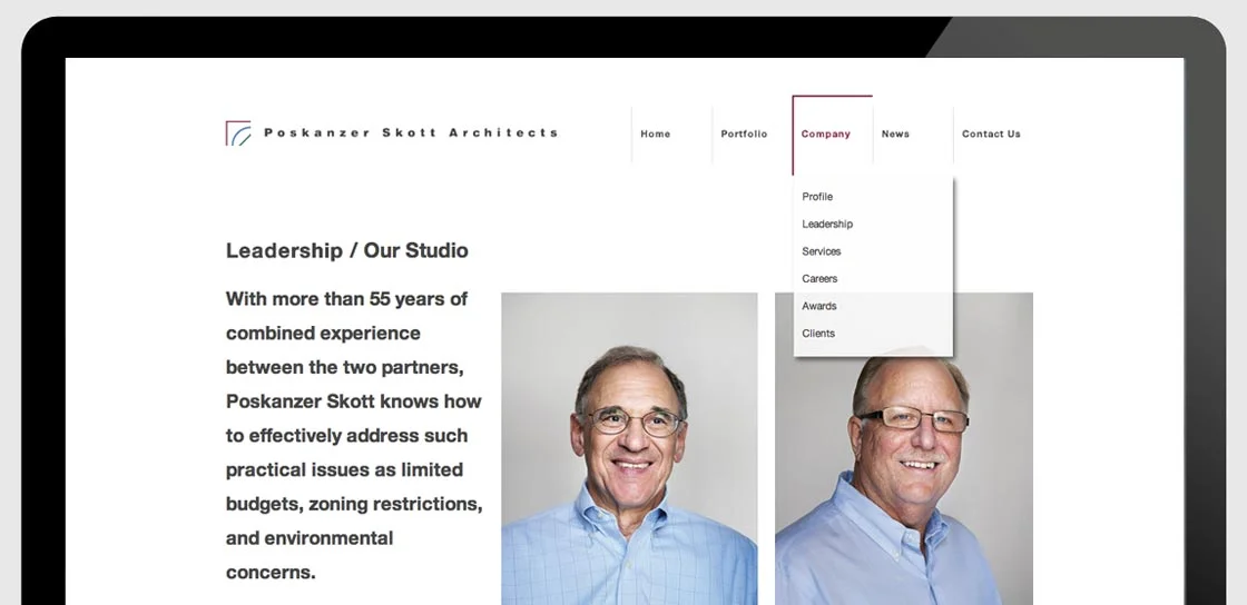 We needed to understand key business drivers and audiences to reflect the breadth and depth of the Poskanzer Skott Architects portfolio and their approach to design and problem solving. It was important to Poskanzer Skott Architects to retain the fundamental components of their identity. Following the identity evolution, we would design and implement the new website and train the staff on the CMS platform.
